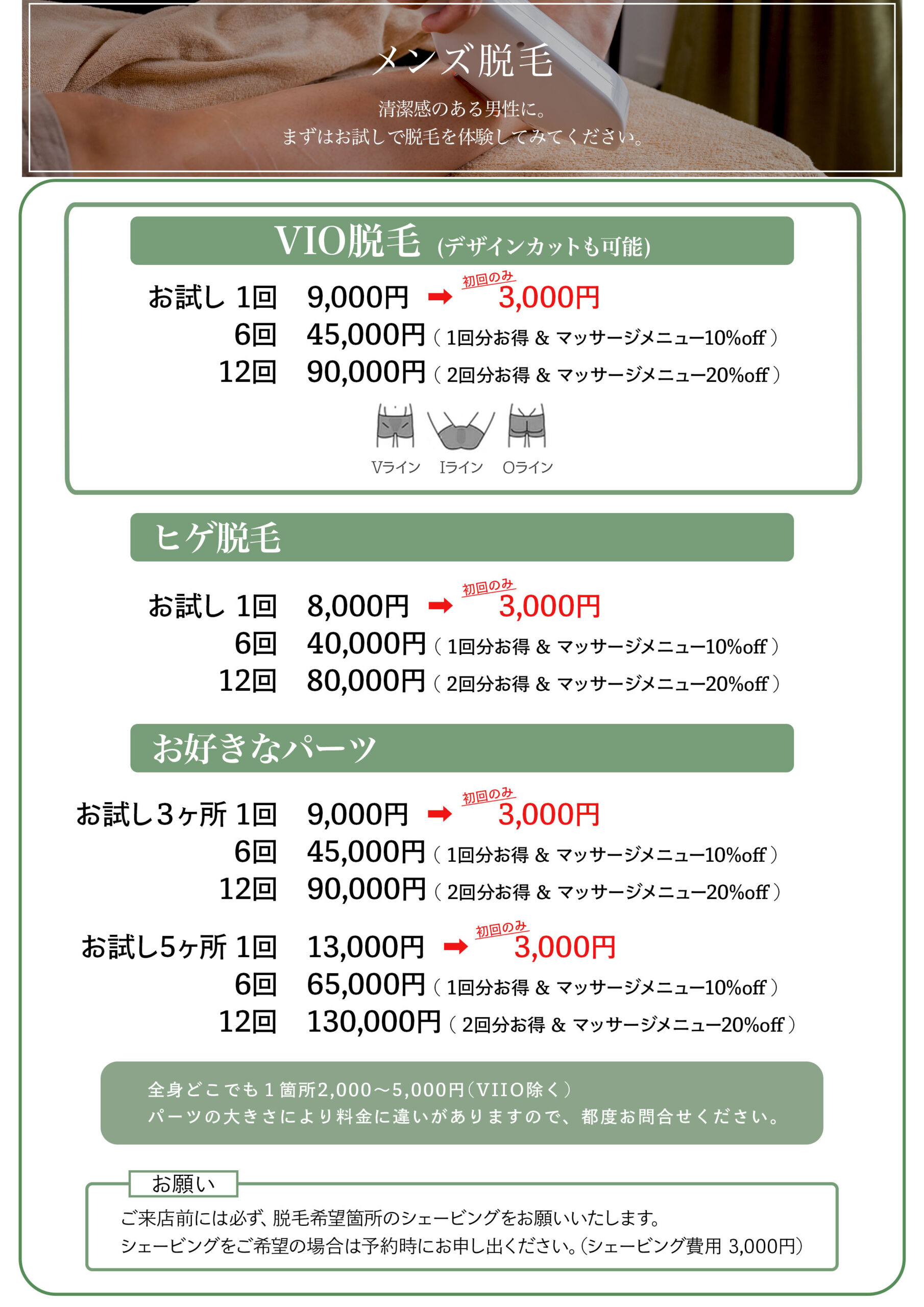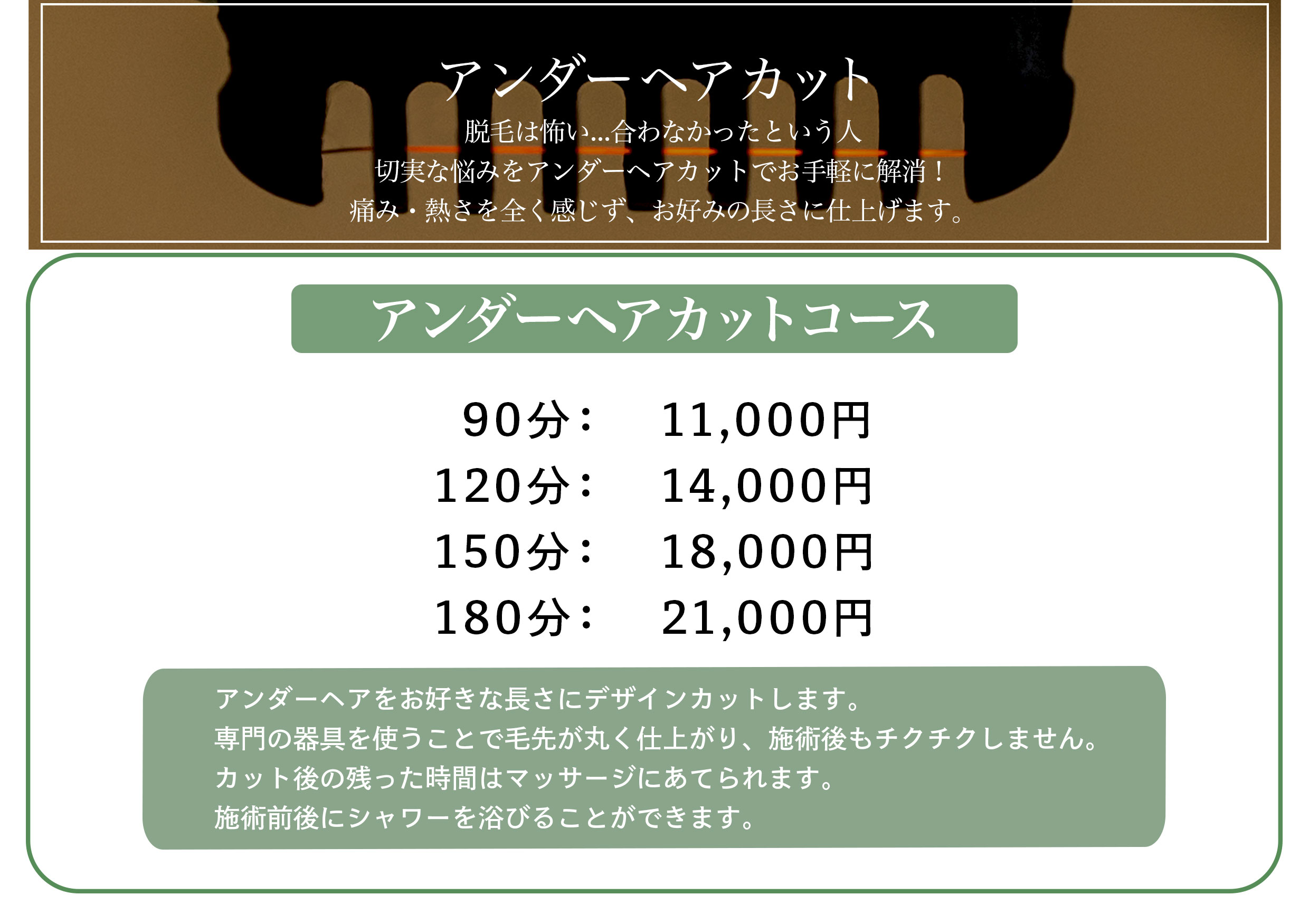 光脱毛・アンダーヘアカット・リラクゼーションメニューをご用意しています
